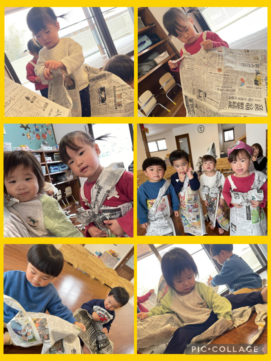 丸めた新聞紙を使って「おには そとー!」と豆まきの練習をしたり、作ってもらったお洋服を嬉しそうに着ていた子どもたち☺️