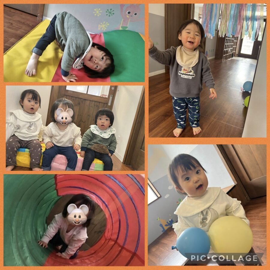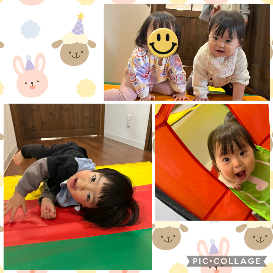 サブレ組さんは、すずらんテープのカーテンで遊びました!カーテンをトコトコ走り抜けたり、顔をのぞかせたり、みんな楽しそうでした😊