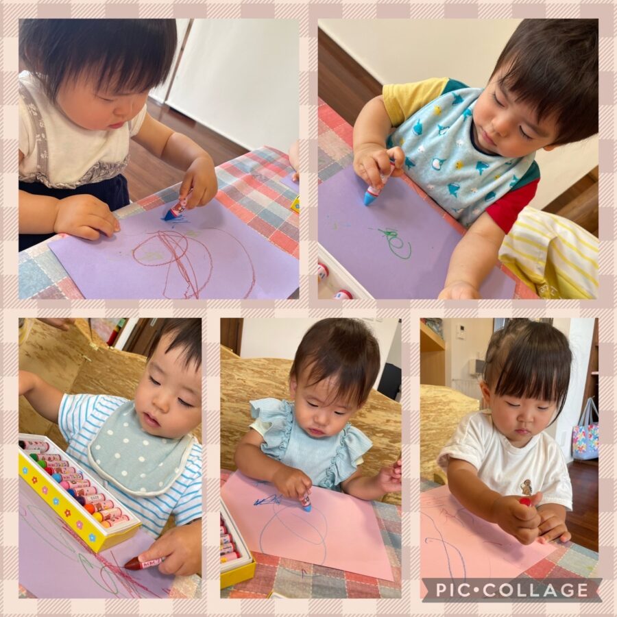 ピンク色、黄色、紫色の中から好きな色の画用紙を選び、クレヨンでなぐり書きをしました☺️