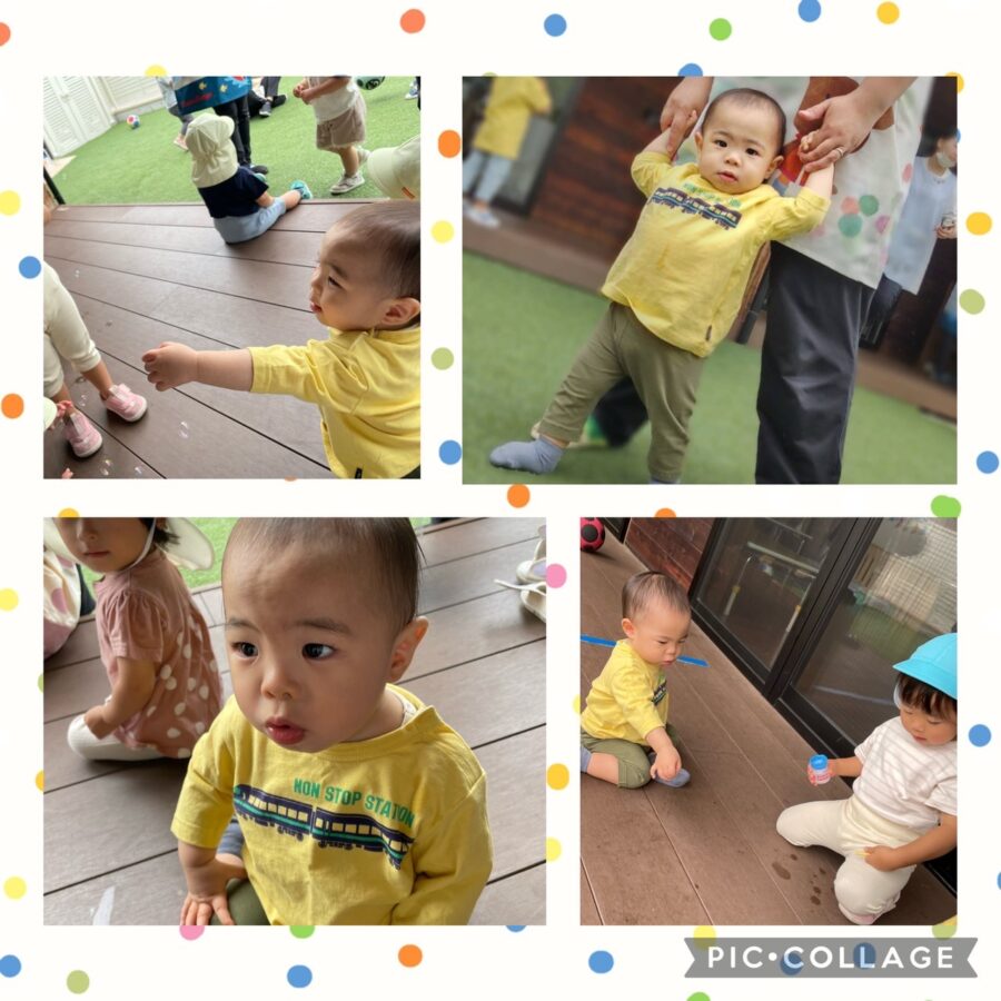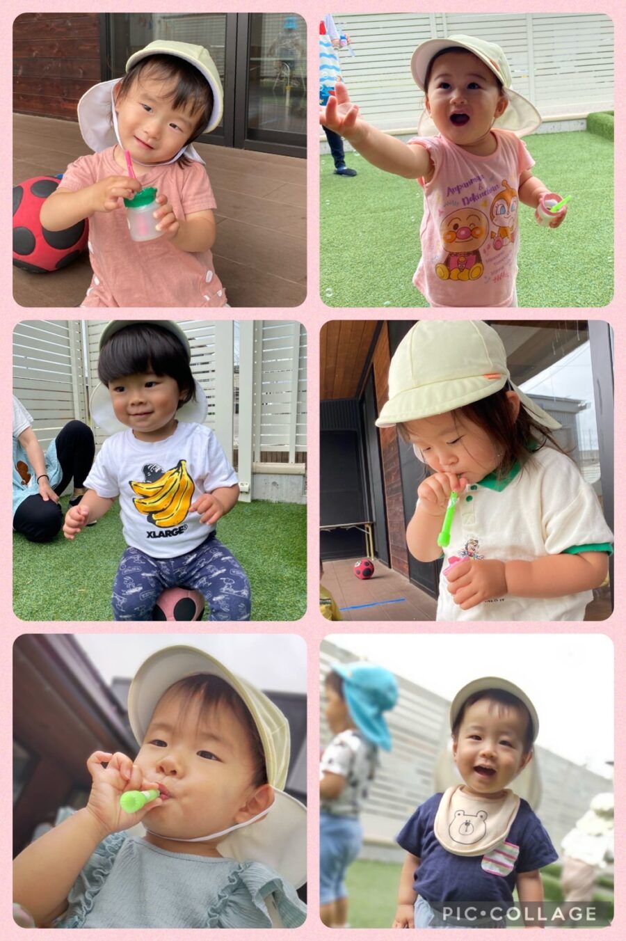 リーフ組さんのお友達にシャボン玉を見せてもらい、手を伸ばして触ろうとしたりお友達がストローで吹いているのを見て真似をして口を尖らせる可愛い姿が見られました☺️