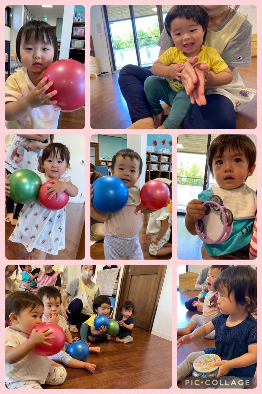 サブレ組さんは室内遊びをしたり、リトミックに参加しました♪室内では気になるおもちゃに手を伸ばして遊びました♪先生と一緒にボールを触ったりしながらリトミックに参加しました♪