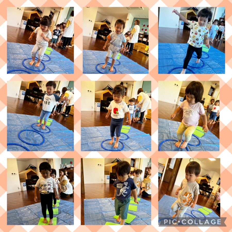 水たまりに見立てたシートの上をジャンプしたり、マットを渡ったりしました😊