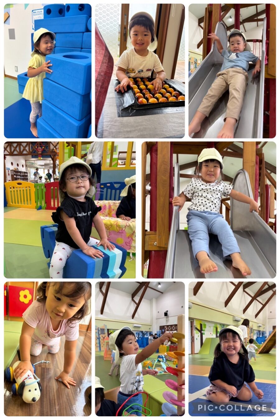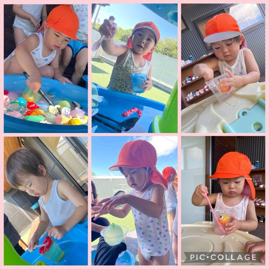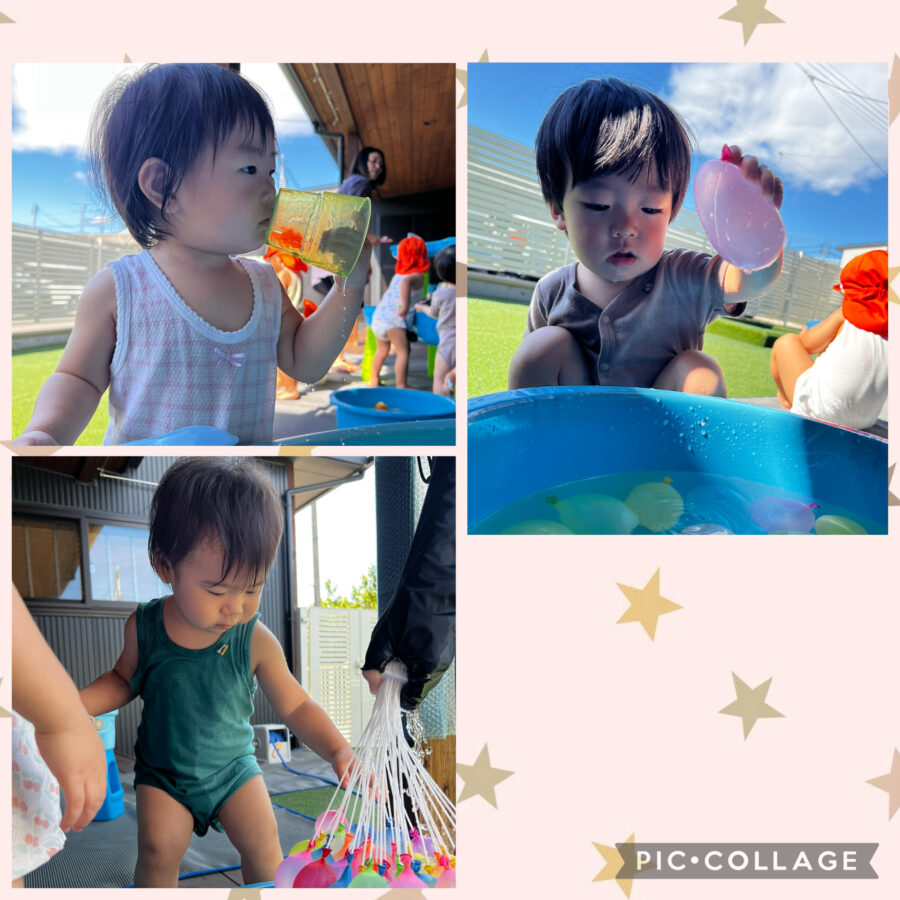 コップに水風船やおもちゃを入れてジュース作りをしたり、作ったものを「おいしいね〜」と食べる真似をして楽しむ子どもたちでした🥤🫧