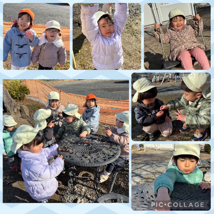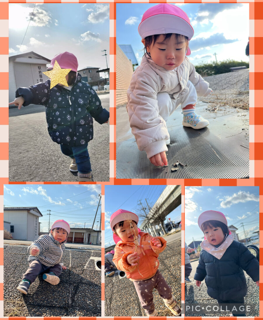 雪が残っているところを歩いてみたり、追いかけっこをしたり、木の枝や石を集めたり、電車を見たりと、ニコニコの子どもたちでした😆