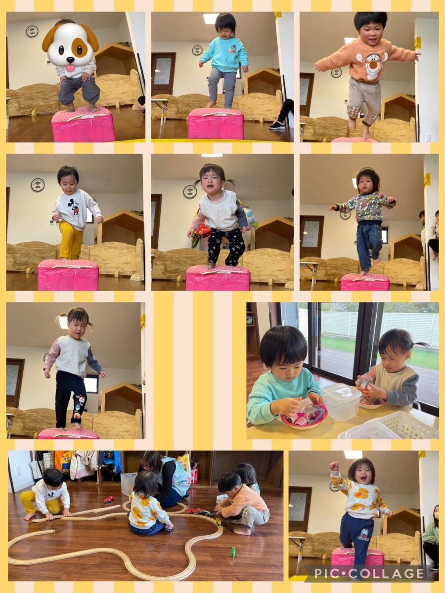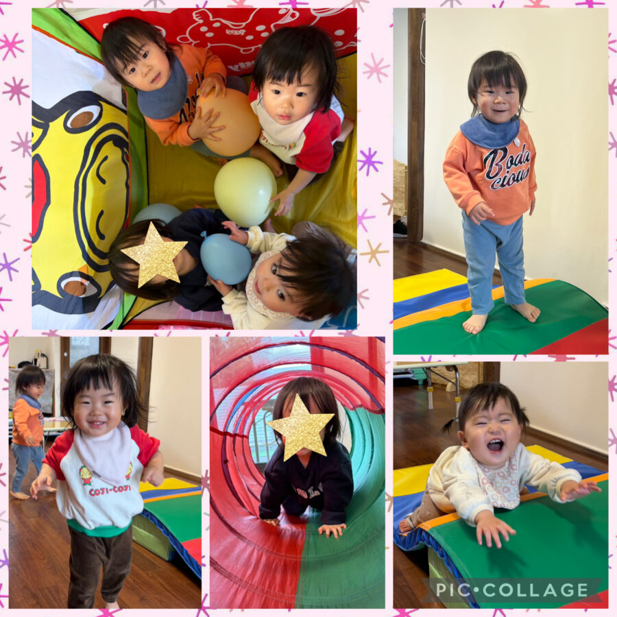くねくねの平均台、テーブルのトンネル、台の上からジャンプなど、たくさん体を動かして楽しみました♪