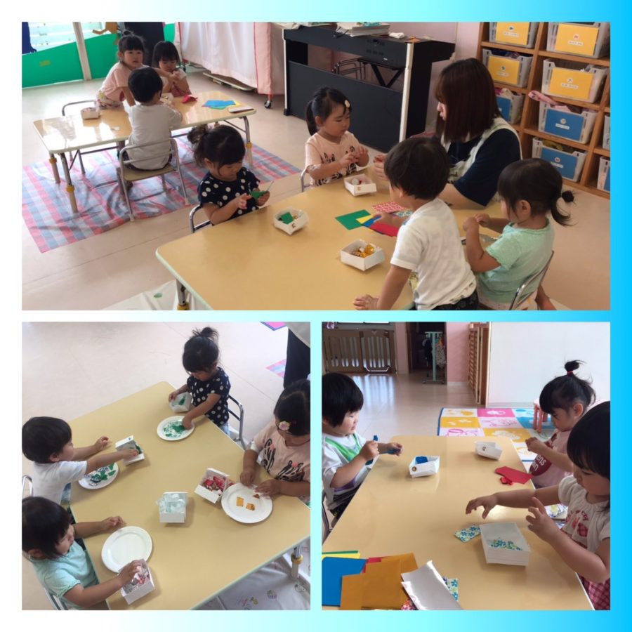 ブルー組さんは、画用紙や折り紙を破いて、紙皿に貼りました😊