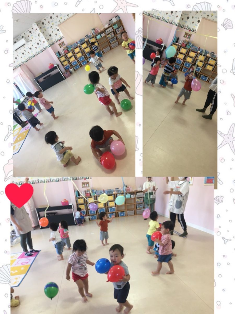 ミカン組さんとポム組さんは、お散歩から帰って来てから風船遊びをしました!!いろいろな色の風船を飛ばしたり、ぎゅ~っと抱きしめてみたり、大喜びでした♬