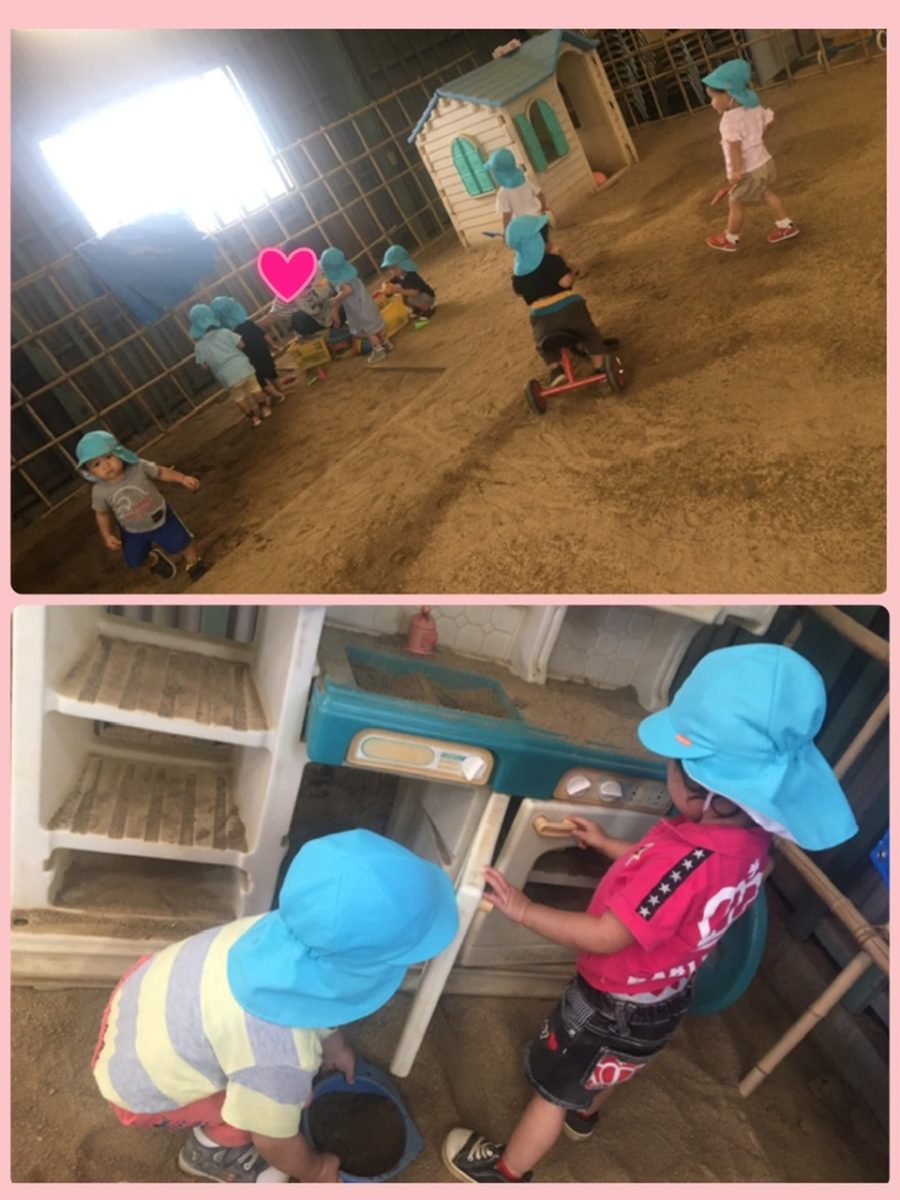 ミカン組さんは砂場にいるダンゴムシを見て逃げたり、キッチンで料理をしたりして楽しみました(≧∇≦)