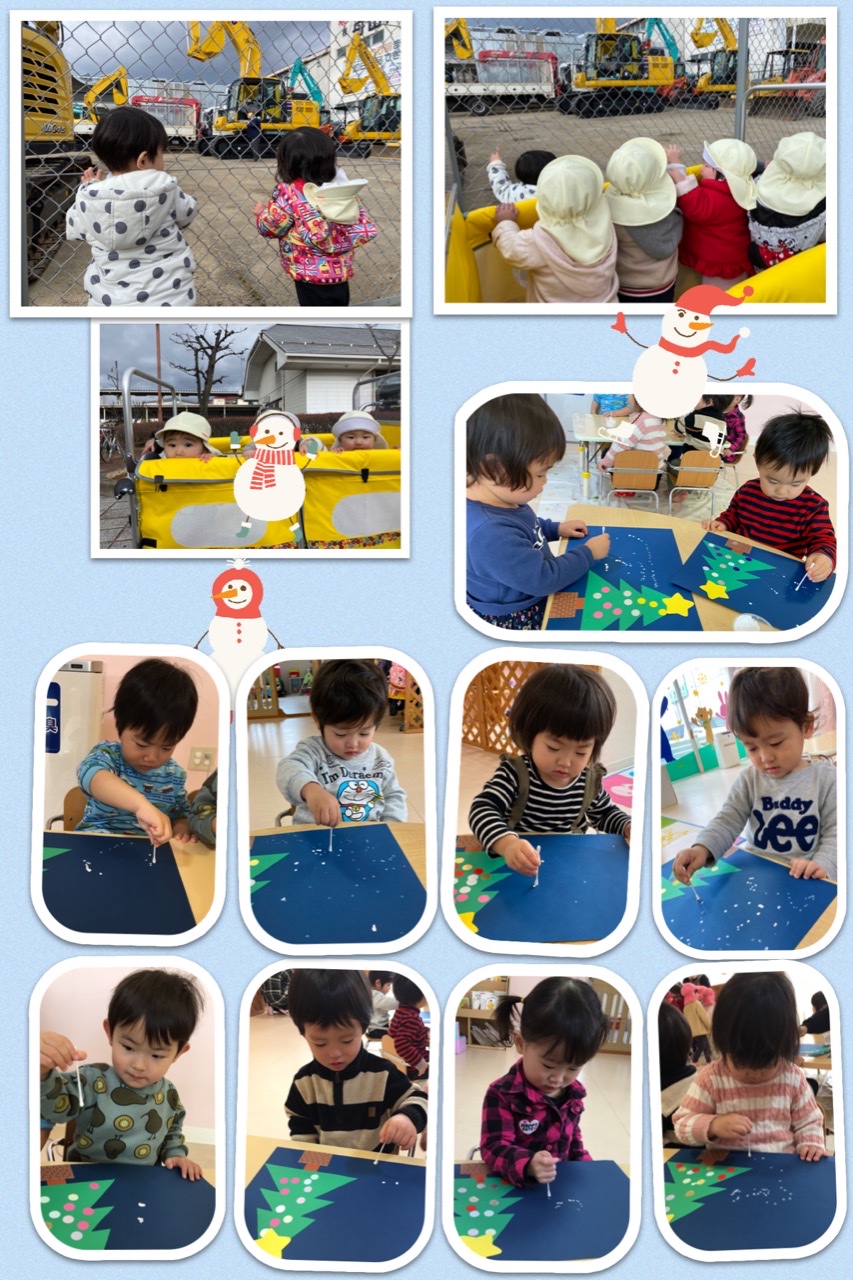 ミカン組さんは製作で、綿棒に白い絵の具をつけ、トントンと雪を降らせました❄️
