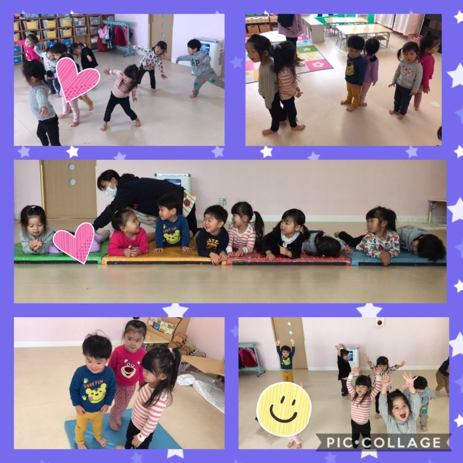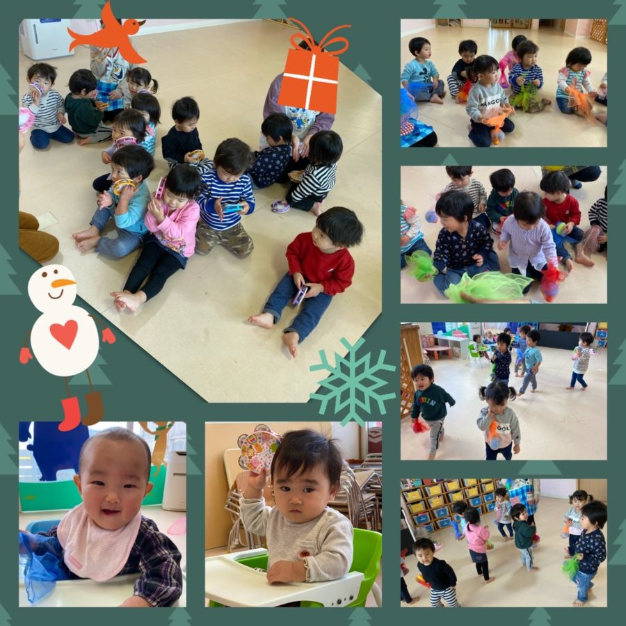 ポム組さんとミカン組さんは、クリスマスの音楽に合わせて、布に入ったプレゼントを動物になって運んだり、タンバリンでリズムを取ったりと、ニコニコで参加してくれました🎁♪