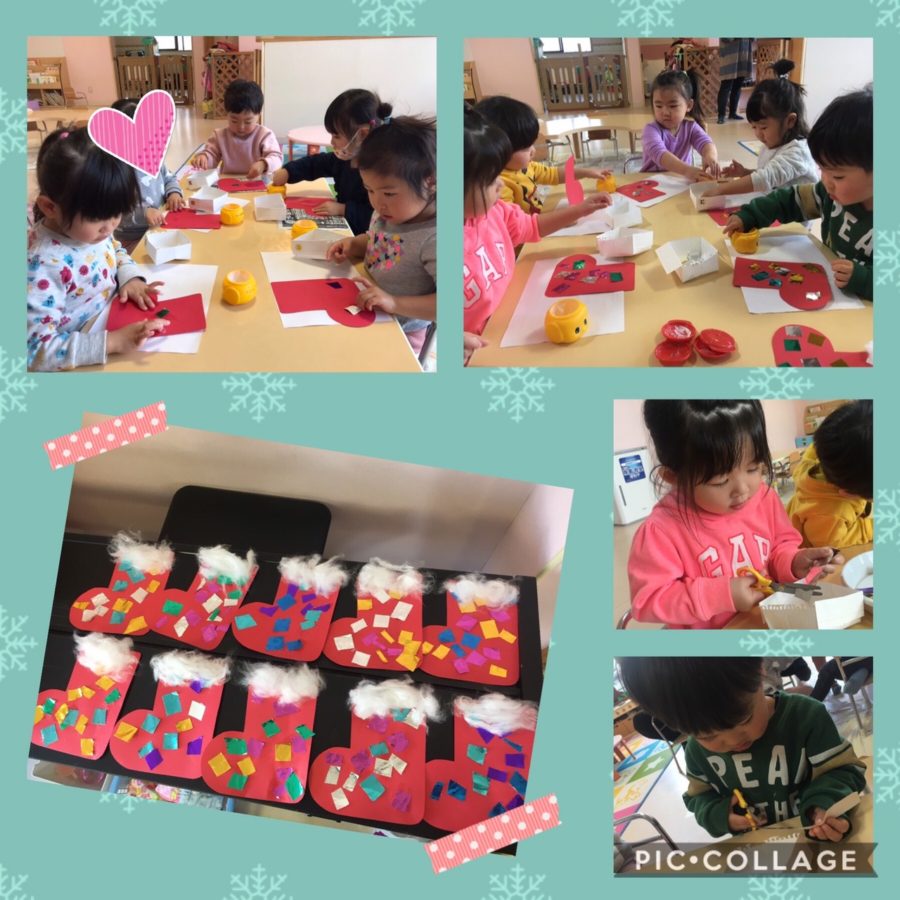 キラキラ折り紙をハサミで切って、のりで貼り付け、素敵な作品ができました🎄🎅🏻