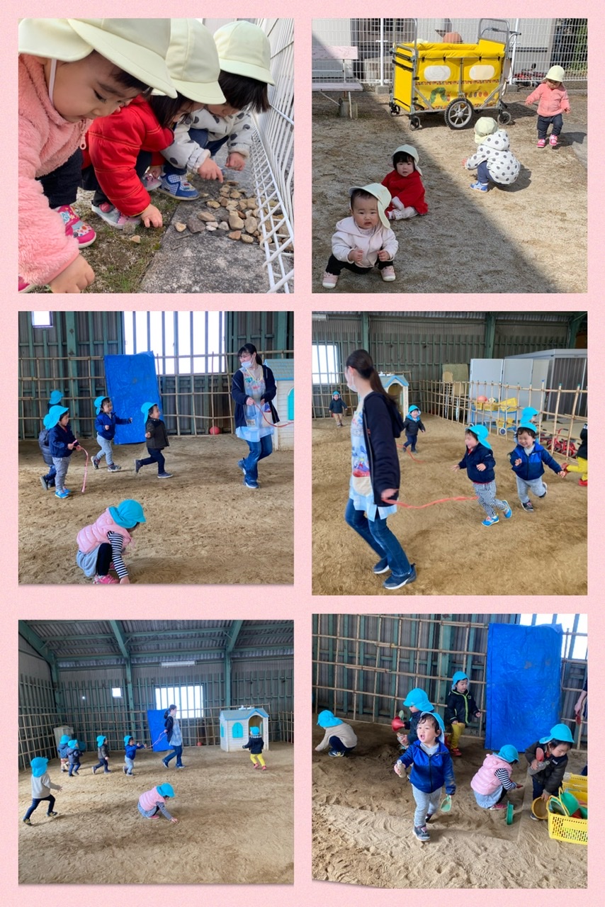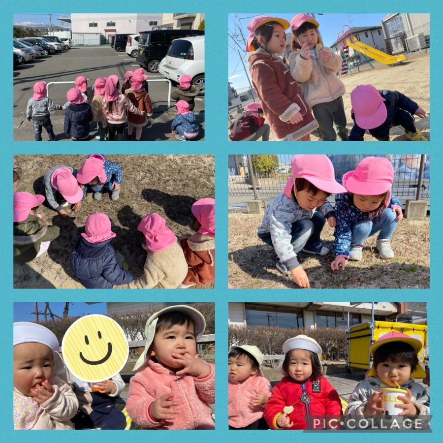 雪が積もってる山を見つけて、「まっしろだー」とみんなで見たり、公園でつくしを見つけたりしました♪