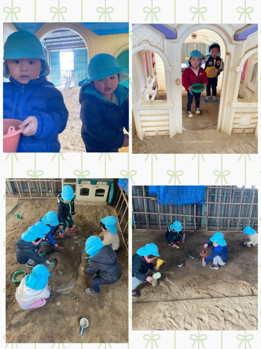 ミカン組さんは運動場へ行き、しっぽ取りをしてたくさん走ったり、砂場でアイスやジュース、お山などを作ったりと、楽しく遊びました😊