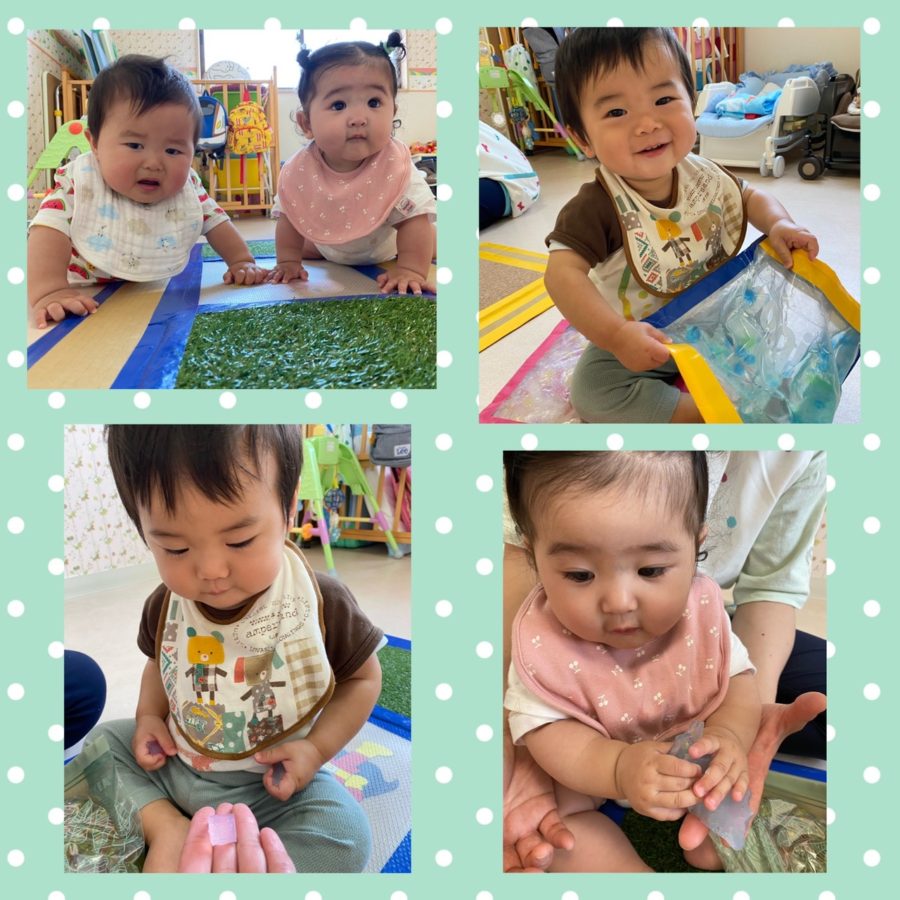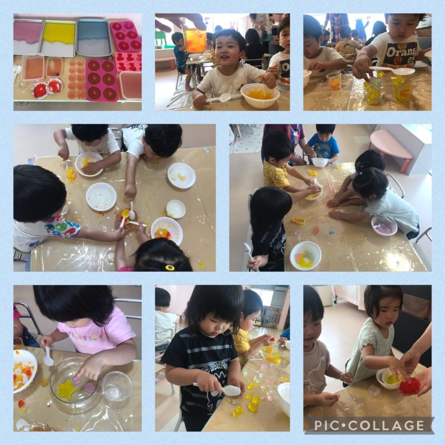 ミカン組さんとブルー組さんは寒天遊びをしました。「冷たいねー」「プルプルだね」と大喜びのお友達。両手でグニュグニュと掴みながら寒天の感触を楽しみました♫