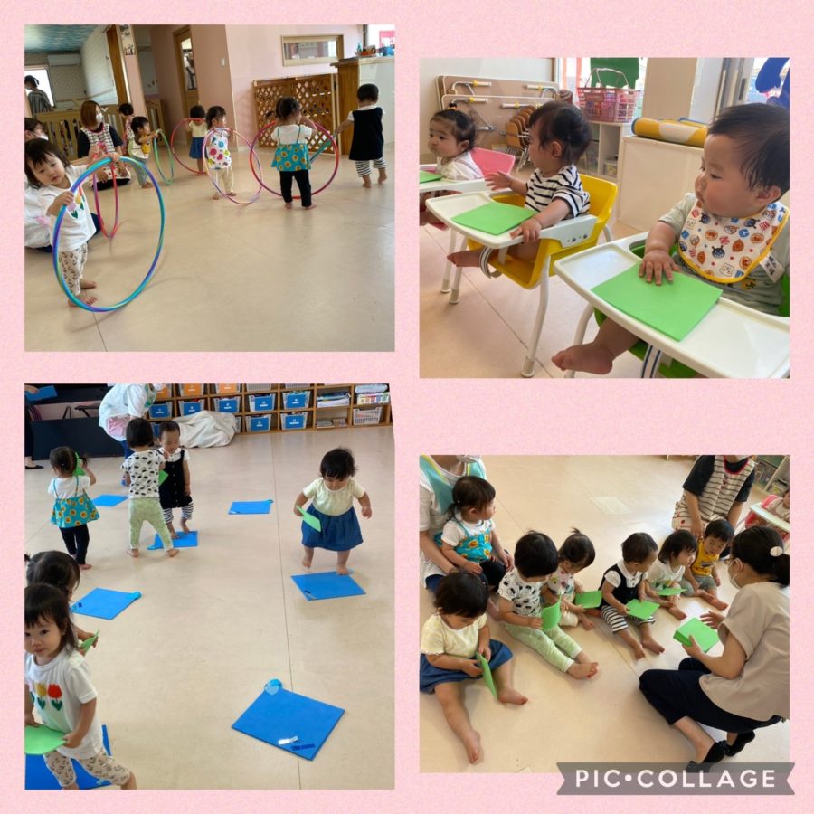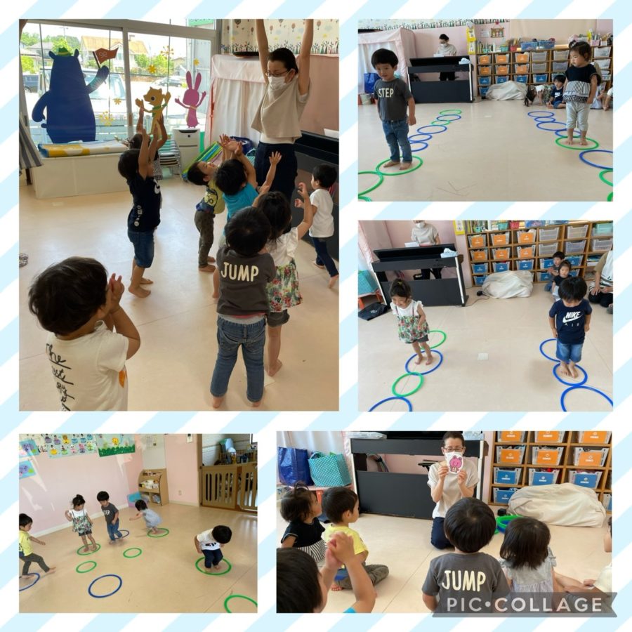ブルー組さんは、カエルになりきったり、青色と緑色の輪を水溜まりに見立ててピョンピョン跳んだりして、梅雨の時期ならではの表現遊びを楽しみました☂️🌈