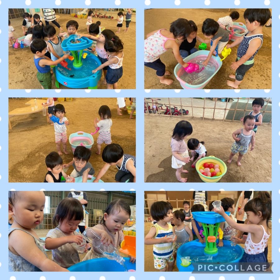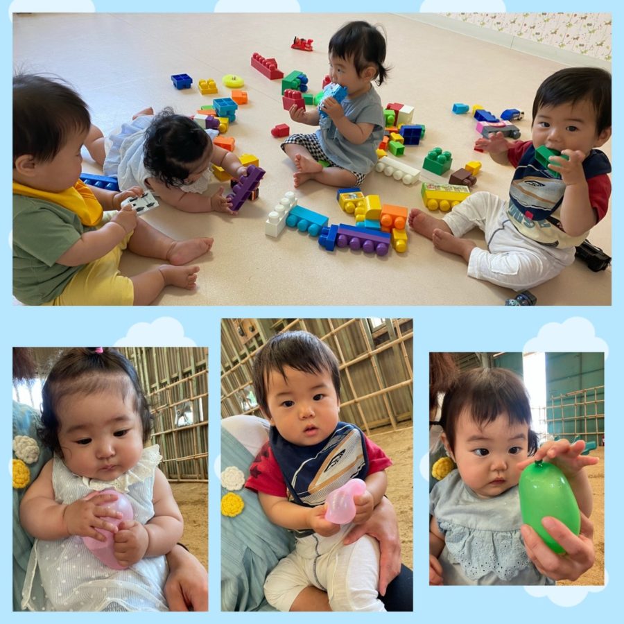 少しだけ、1、2歳児さんの水遊びに混ぜてもらい、不思議な水風船の感触を楽しんでいました✨