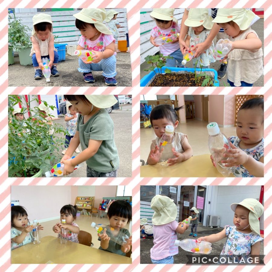 ミカン組さんは、プールで使うジョウロ作りをしました♪からのペットボトルに自由にテープを貼りました😊せっかくなので、お外に出て水を入れてもらい野菜に水やりをしたり、地面にシャワーのように水かけをしながら楽しみました!!自分で作ったジョウロで、とても大喜びのミカン組さんです⭐︎プール遊びでも使いたいと思います😊