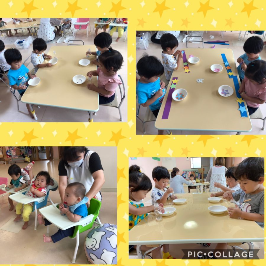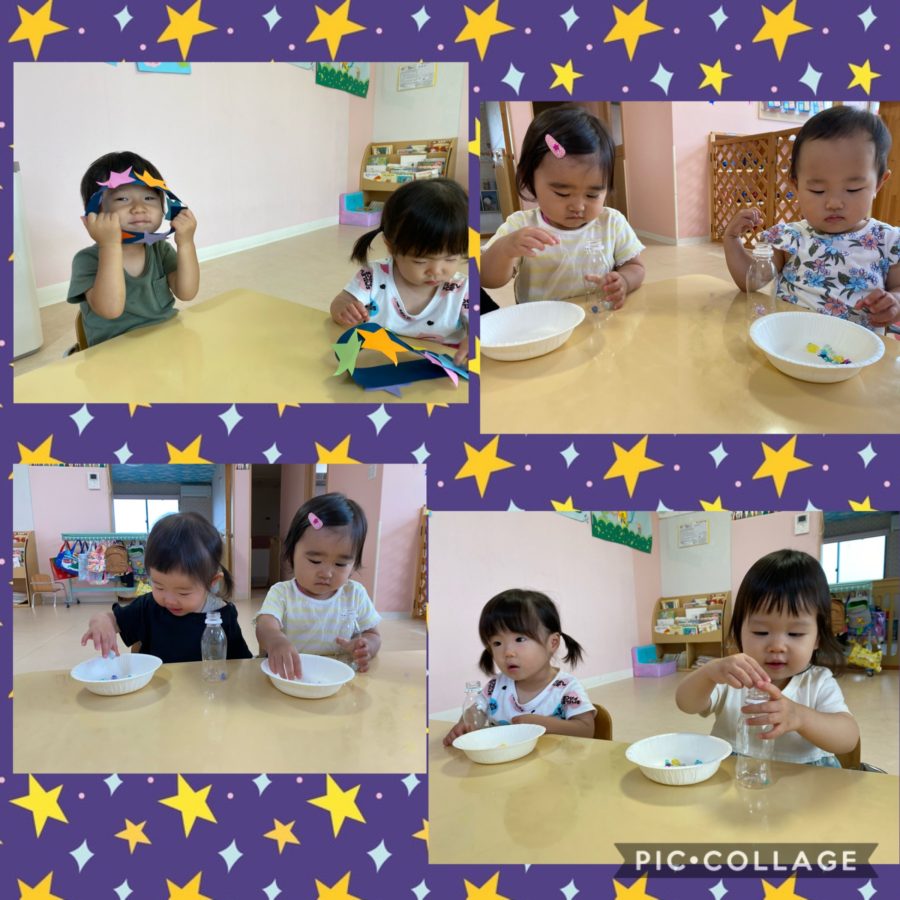 今日は、七夕会がありました🎋各クラスの製作物を紹介してもらったり、七夕のお話を聞いたり♬その後は、みんなでキラキラ光るスパンコールやいろんな形と、色のビーズを空容器に入れてセンサリーボトルを作りました✨ビーズが中に入ると音を鳴らしたり、キラキラ光るビーズに『キレ〜ッ』と大喜びでした♪また、冠を作ってみんなで記念撮影!!みんなの願いが届きますように😊