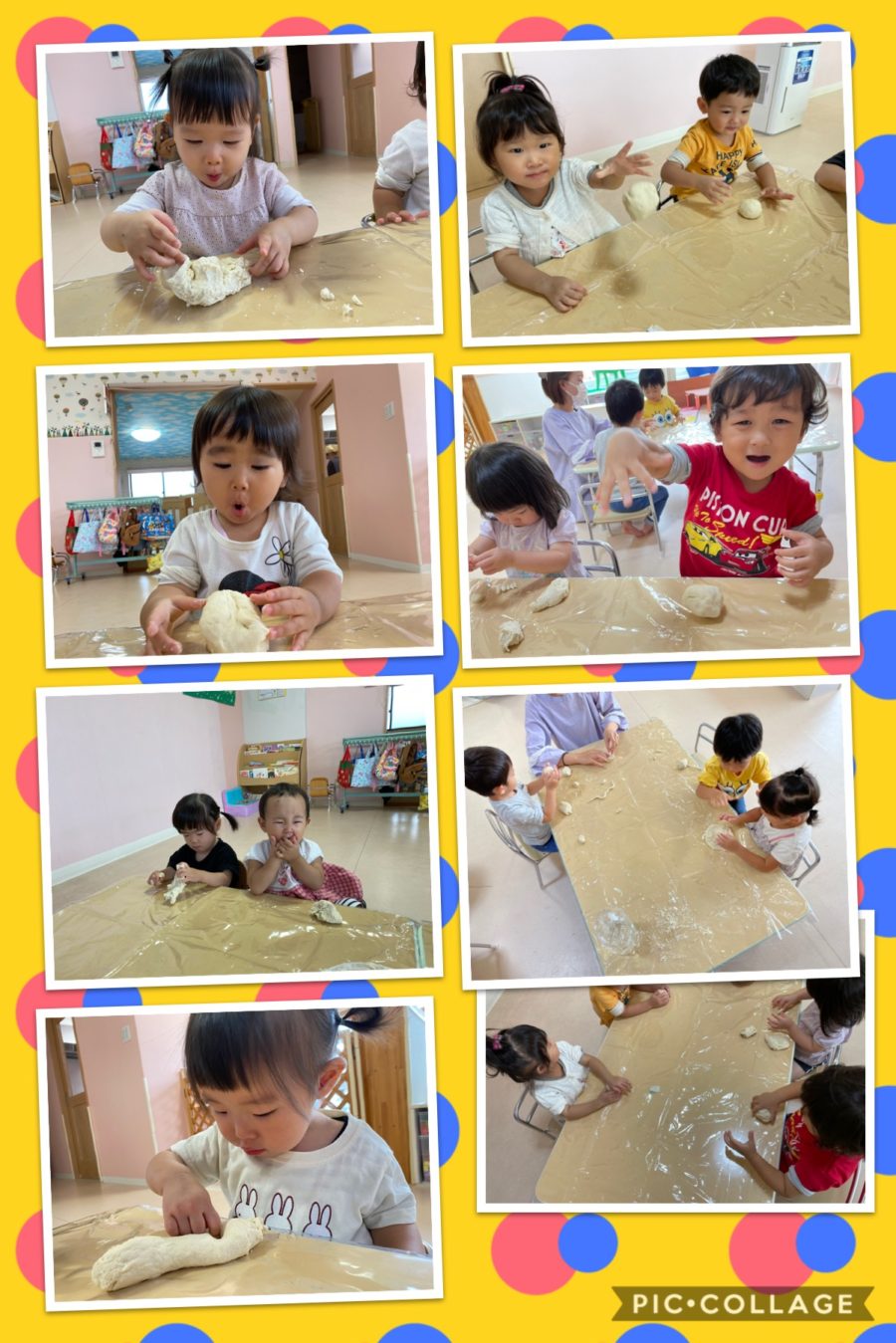誕生会の後はミカン組さんブルー組さんは、小麦粉粘土を楽しみ、こねてる様子に頑張れ!!と応援する子どもたち😊パン作り、アイス作り、いろいろ作って、ごっこ遊びで大賑わいでしたよ♬