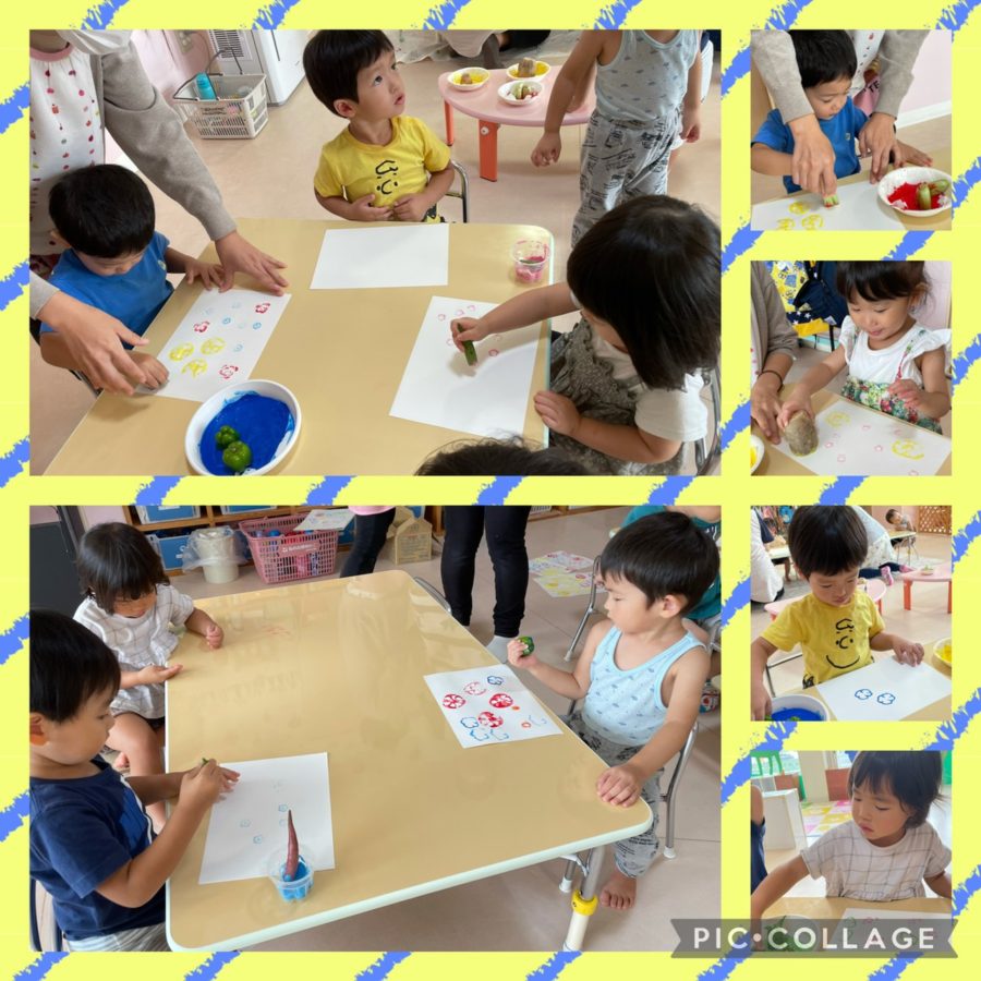 今日は、野菜スタンプに挑戦🫑🥬保育園で育てたオクラなどを使って、野菜に絵の具をつけて台紙にペタペタ!オクラ、ピーマン、レンコン、小松菜の中から選んでスタンプのようにペタペタ♬いろいろな模様ができました!!