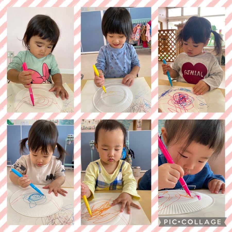 ミカン組さんは、お店屋さんごっこで被るサンバイザー作りをしました♬みんな自分の好きな色のペンを選んで、なぐり描きをしました(!)『いらっしゃいませ〜するの!!』と楽しみにしてるミカン組さんです😊