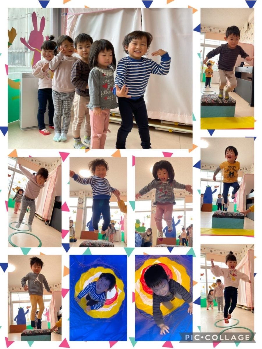 ブルー組さんはお部屋でサーキット遊び♪跳び箱からジャンプしたりトンネルをくぐったりして体をたくさん動かしました。だんだん高ーくジャンプできるようになってきたブルー組さんです😊