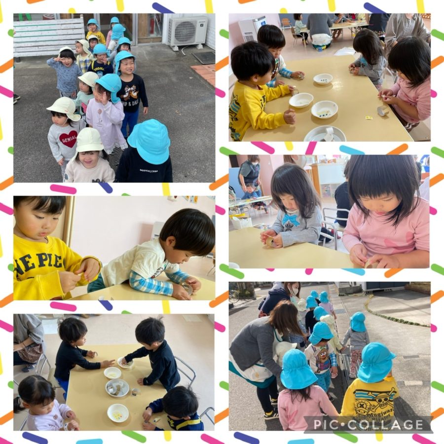 ブルー組さんは、お店屋さんごっこに向けてバングル作りをしました✨星のシールをペタペタ貼り、完成したバングルを腕につけて、「可愛いでしょ〜」と嬉しそうなお友達でした😊 製作後は、ミカン組さんとブルー組さん一緒にお散歩に行きました🍂