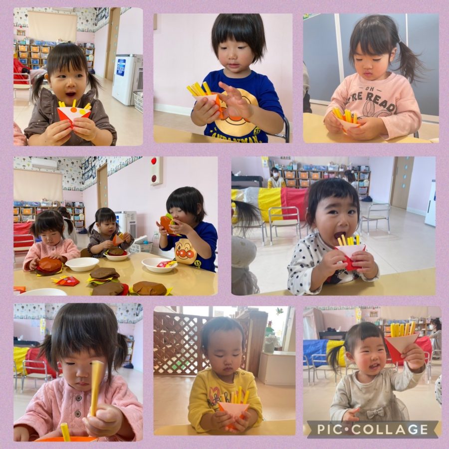 ミカン組さんは、最後の仕上げとして、ハンバーガーセットのポテト🍟を作りました♪ポテトを入れる袋にシールを自由に貼り、自分でポテトを詰めました♬みんな、『いただきまーす😆』とお喋りを楽しみながら、完成させてましたよ😊