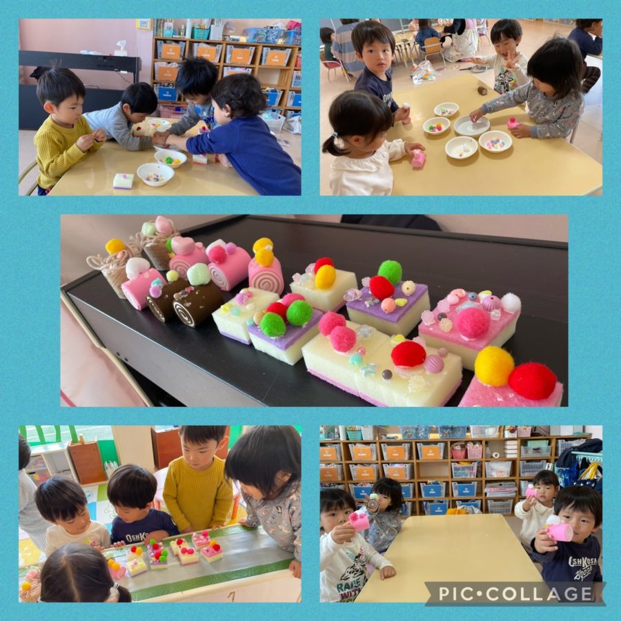 ブルー組さんは、お店屋さんごっこに向けてケーキ作りをしました🍰ビーズなどを使って飾り付けをし、「おいしそう〜」「かわいい〜」と嬉しそうに眺めていた子ども達でした😊🧡