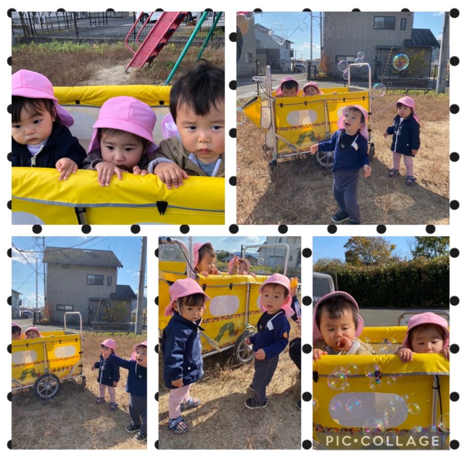 ポム組さんはお散歩に行きました。公園でシャボン玉をすると、「あっ!あっ!」と指差したり追いかけたりして大喜びな子どもたちでした😊