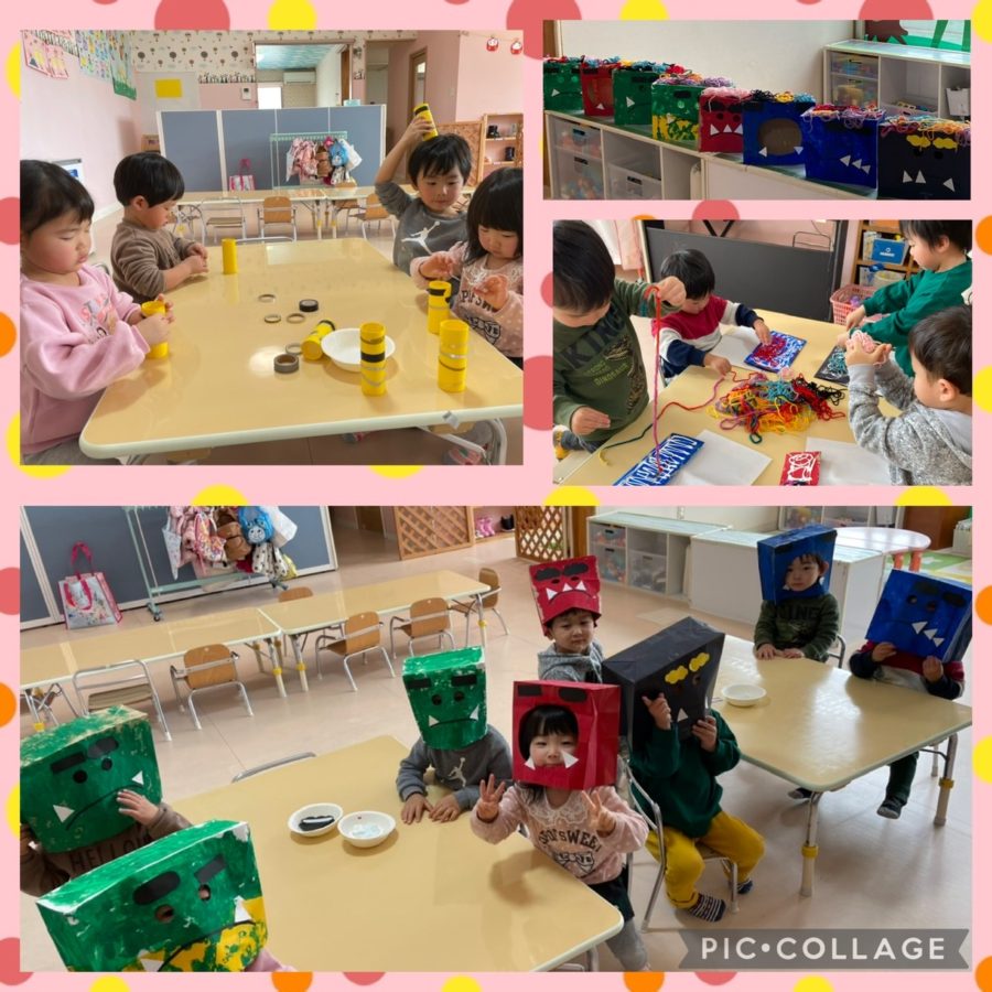 今日は製作で鬼のお面を作りました。「僕はツノ2本にする」「眉毛はこれー」とそれぞれイメージを膨らませながら楽しく作りました♫