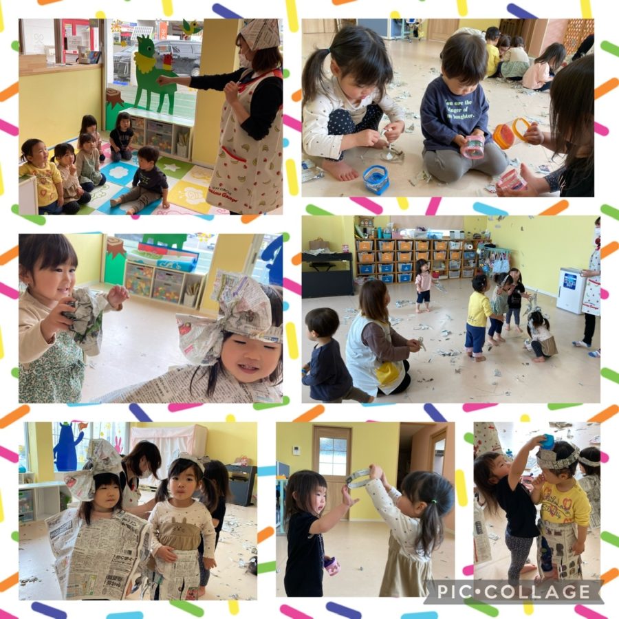 ブルー組さんは新聞紙遊びをしました。手作りクラッカー🎉の中に細かくちぎった新聞紙を入れて飛ばしたり、新聞紙のお洋服を身にまとって笑顔の子どもたちでした😊