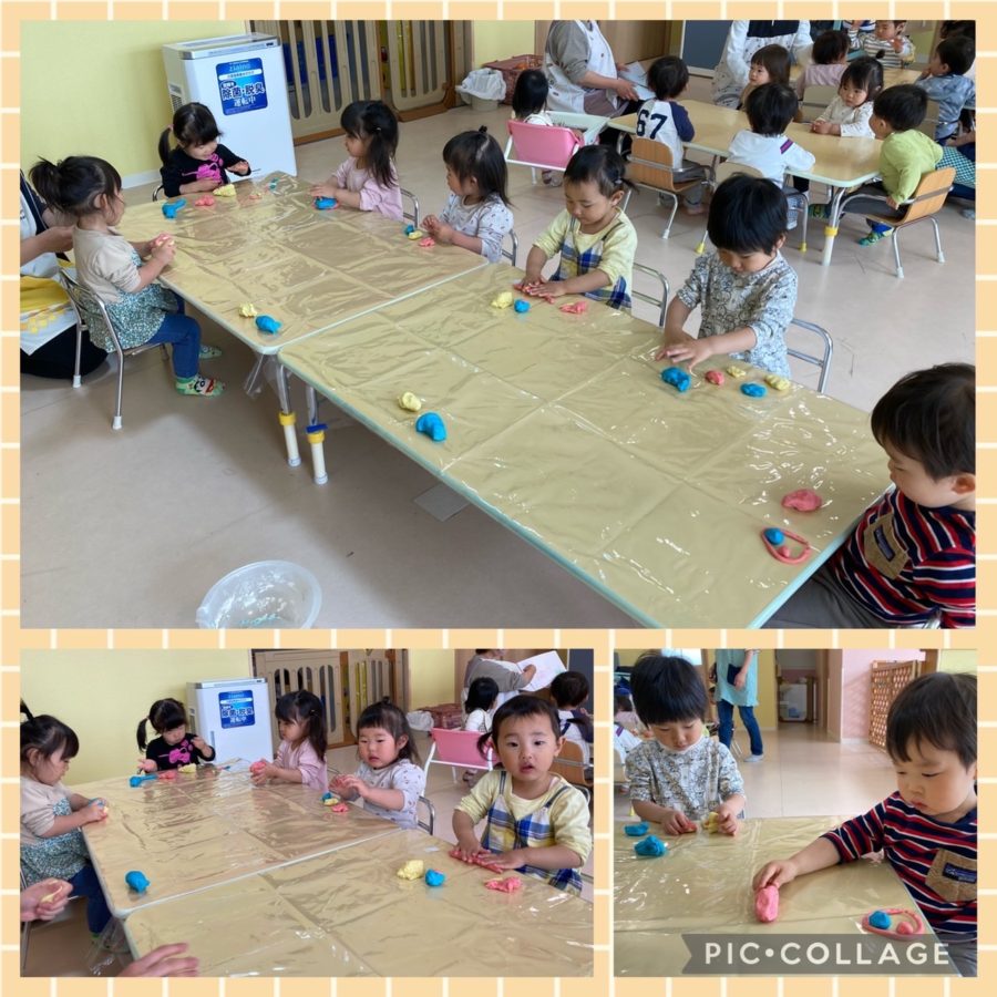 ブルー組さんは小麦粉粘土で遊びました。カラフルな粘土に大喜びのブルーさん。ちぎったり丸めたり伸ばしたりして粘土の感触を十分楽しみました♪