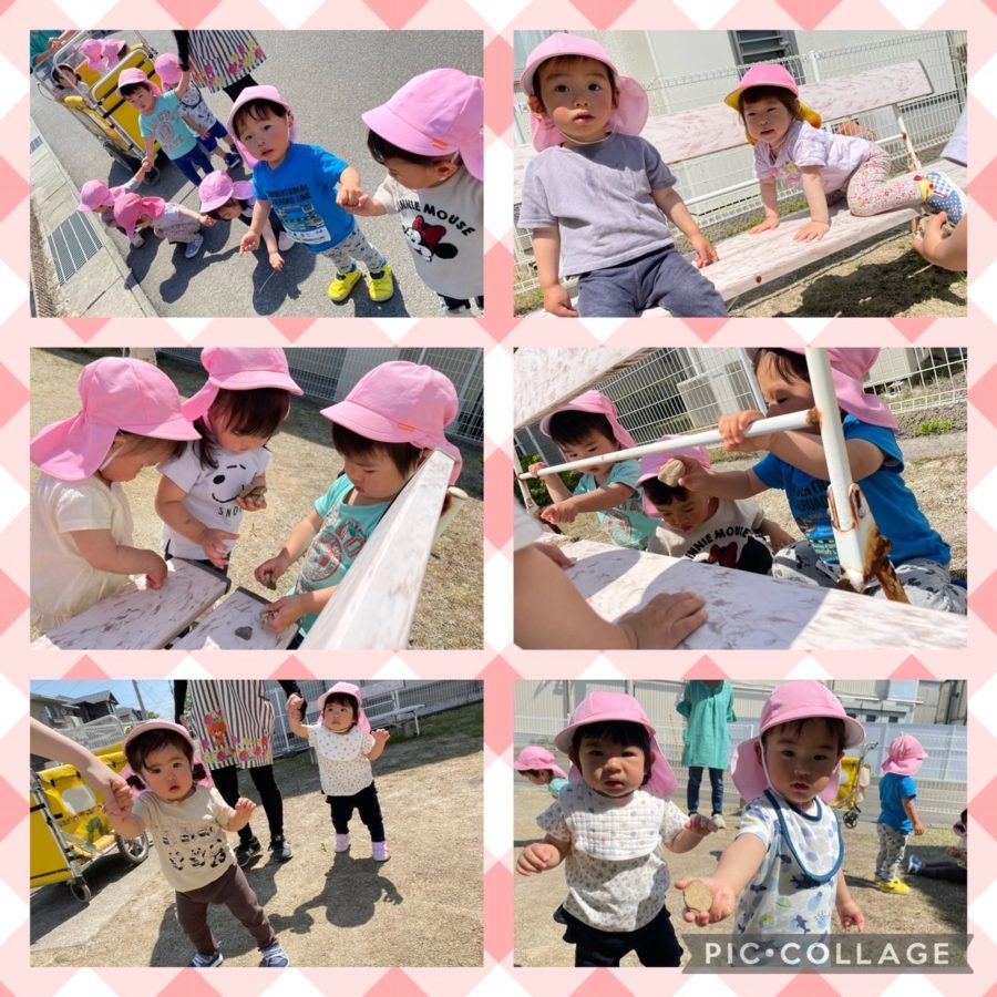 ミカン組さんも、近くの公園までお散歩に行きました✨お友達とベンチに石を並べ、お店屋さんごっこをしてみたり、追いかけっこをしたりと、元気いっぱいでした😊