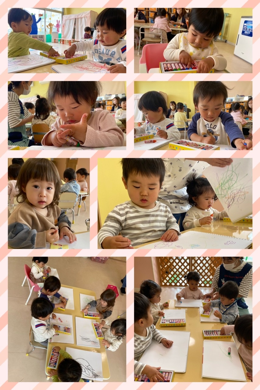 好きなクレヨンの色を手にし、グルグルと殴り書きを楽しんだり、指先でシールを剥がしたり、貼ったりと、集中していました✨