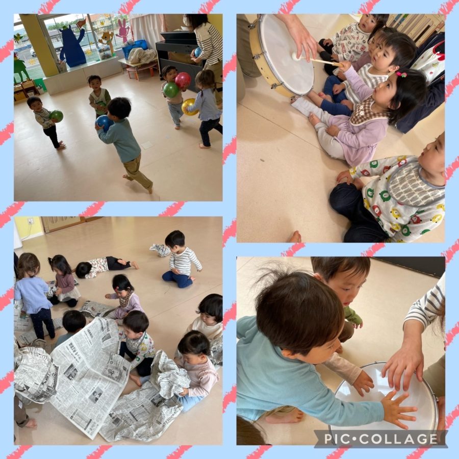ミカン組さんは、音楽に合わせてボールを使ったり、太鼓を叩いて、雷の音を出してみたり、新聞紙をバリバリと破いたり丸めたりと、体全部で楽しむ姿が見られました☺️