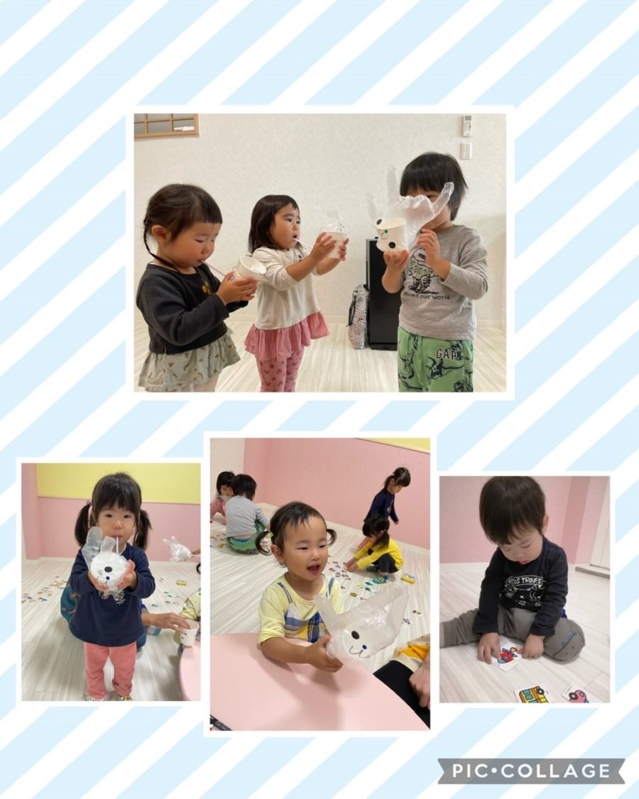 ストローを使って膨らまし、紙コップから飛び出すうさぎやおばけに大喜びな子ども達✨