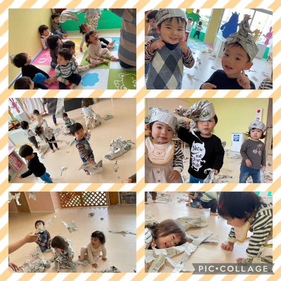 保育者の真似をしてビリビリ破いたり、小さくちぎったりする子ども達😊新聞紙の雨や帽子に大喜びでした✨