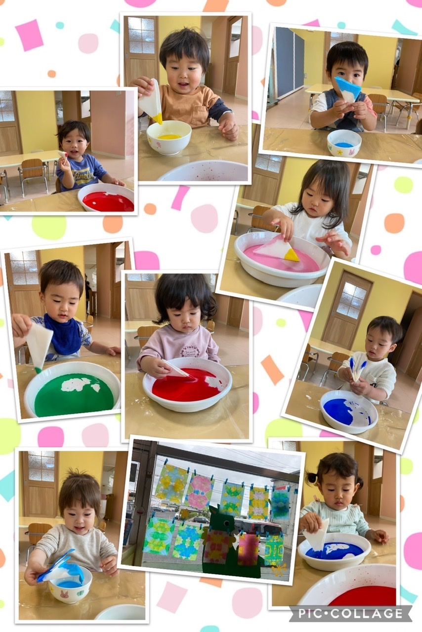 折りたたんだ障子紙を手にいろいろな色の絵の具を自分で選び染み込む様子を楽し観ました😊『えーっと!あお!』と迷いながらも自分で色を選ぶ顔は真剣!開いてできた模様にとても喜んでましたー♪