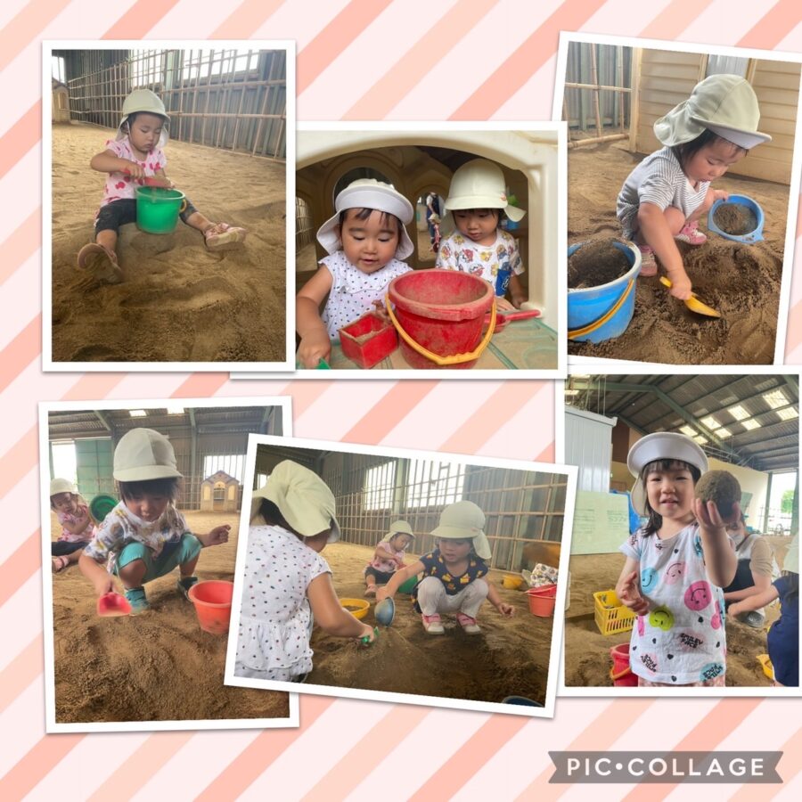 バケツの中に砂を入れてケーキを作ったり、先生に泥団子を作って貰ったり、シーソーや三輪車に乗ったりして楽しみました😊