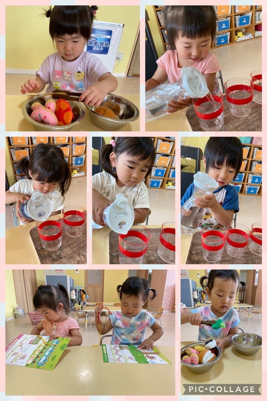 ブルー組さんはお部屋でコーナー遊びをしました。紐通しをしたり、トングで食べ物のおもちゃをはさんだり、水をコップに注いだりしました。「やってみたーい」とお手伝いの活動にやる気満々のブルーさん。楽しみながらも真剣な表情でした😊