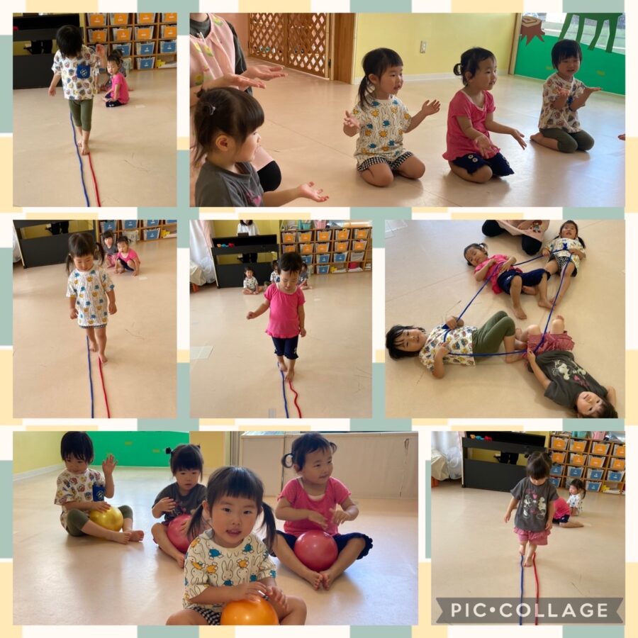 ブルー組、今日のリトミックは初めて紐を使って活動しました。紐の上を落ちないように上手に歩く事ができていましたよ😊 ヘビさんのように紐を動かしてその上をジャンプする時は動く紐に不思議そうにする子もいました!