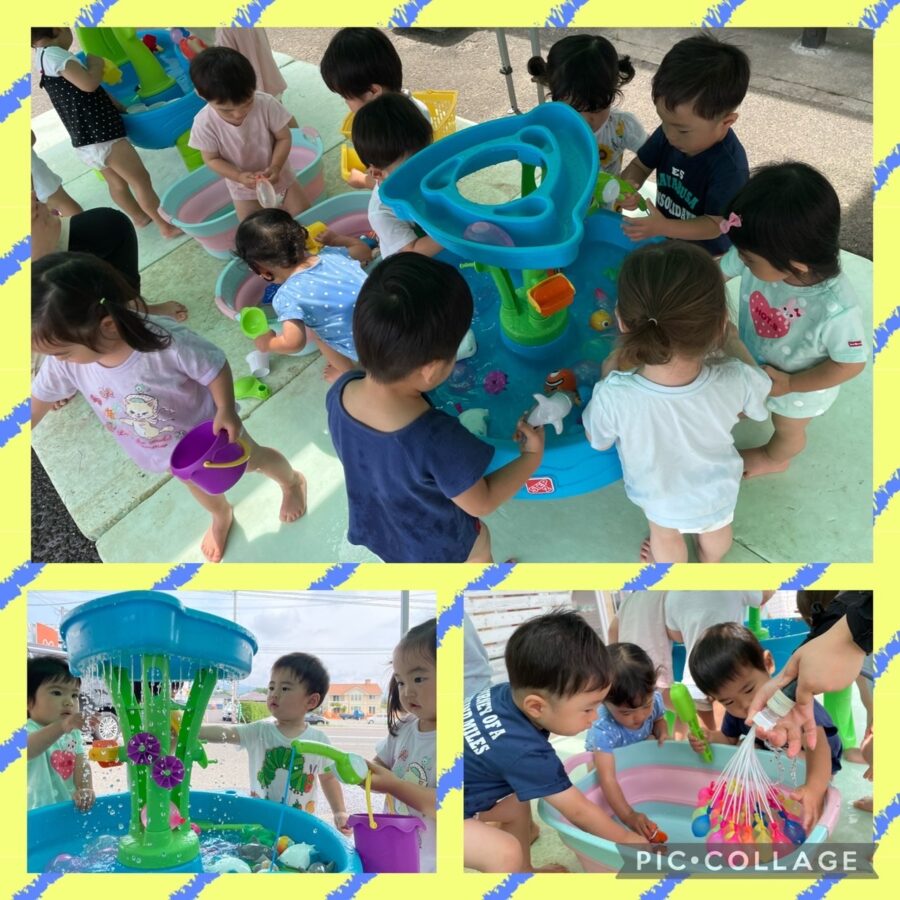 カップの中に水風船を入れ、アイスに見立ててお店屋さんごっこをしたり、スポンジに水を含ませたり、魚釣りやお友達同士で水を掛け合ったりして楽しんでいました🎶¨̮