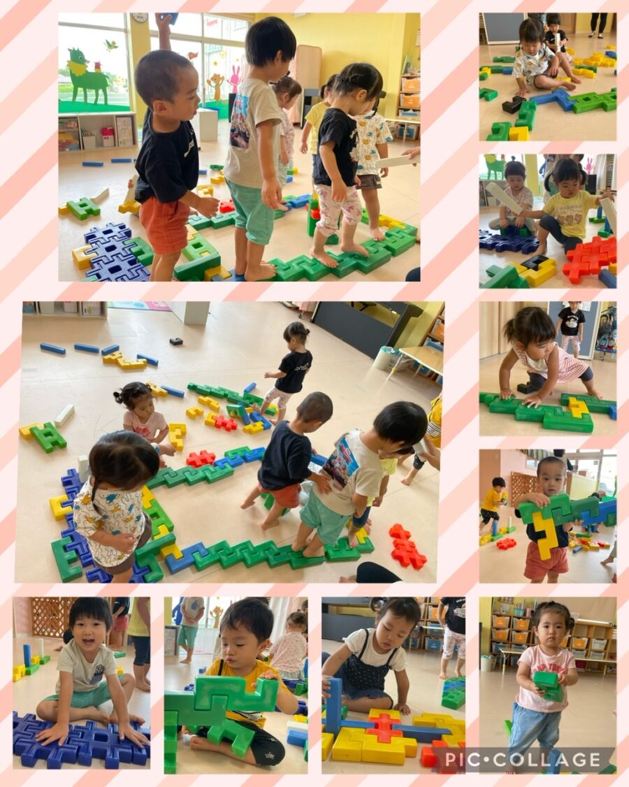 ブロックを長く繋げて電車ごっこをしたり、お風呂を作ったり、平均台を作ってみんなで歩いたりして楽しみました😄