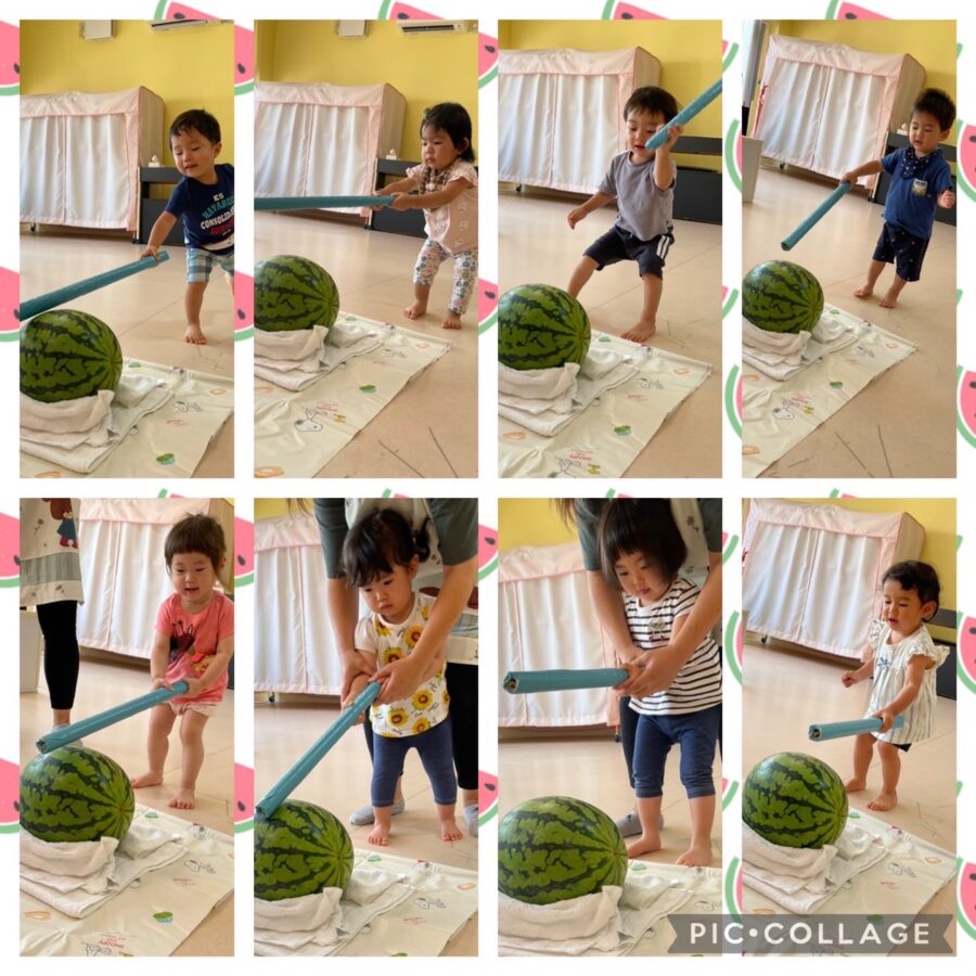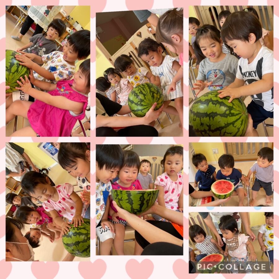 スイカの絵本を見てから、実際のスイカを触ったり、匂いを嗅いだりニコニコな子ども達😄