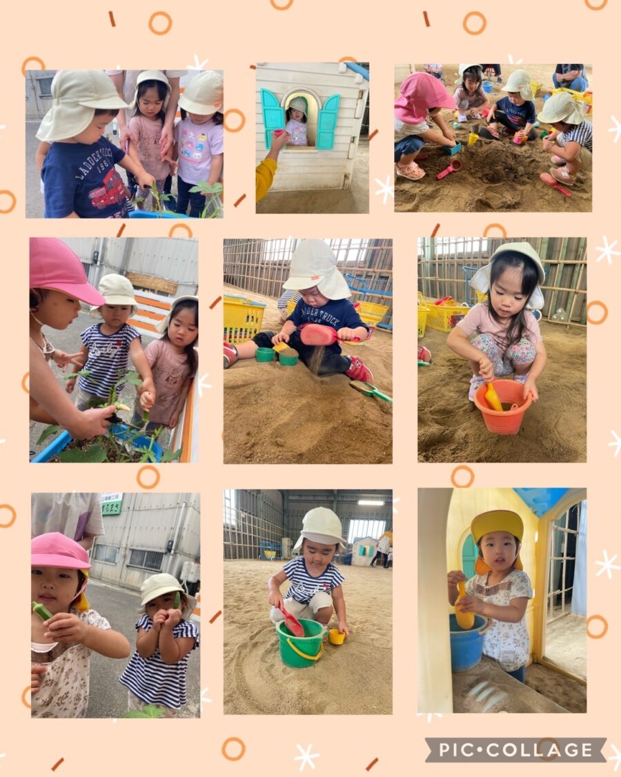 砂場でケーキを作ったり、アイスを作ったり、お家の中に入って「いらっしゃいませ〜」とお店屋さんごっこをして楽しみました😊✨️