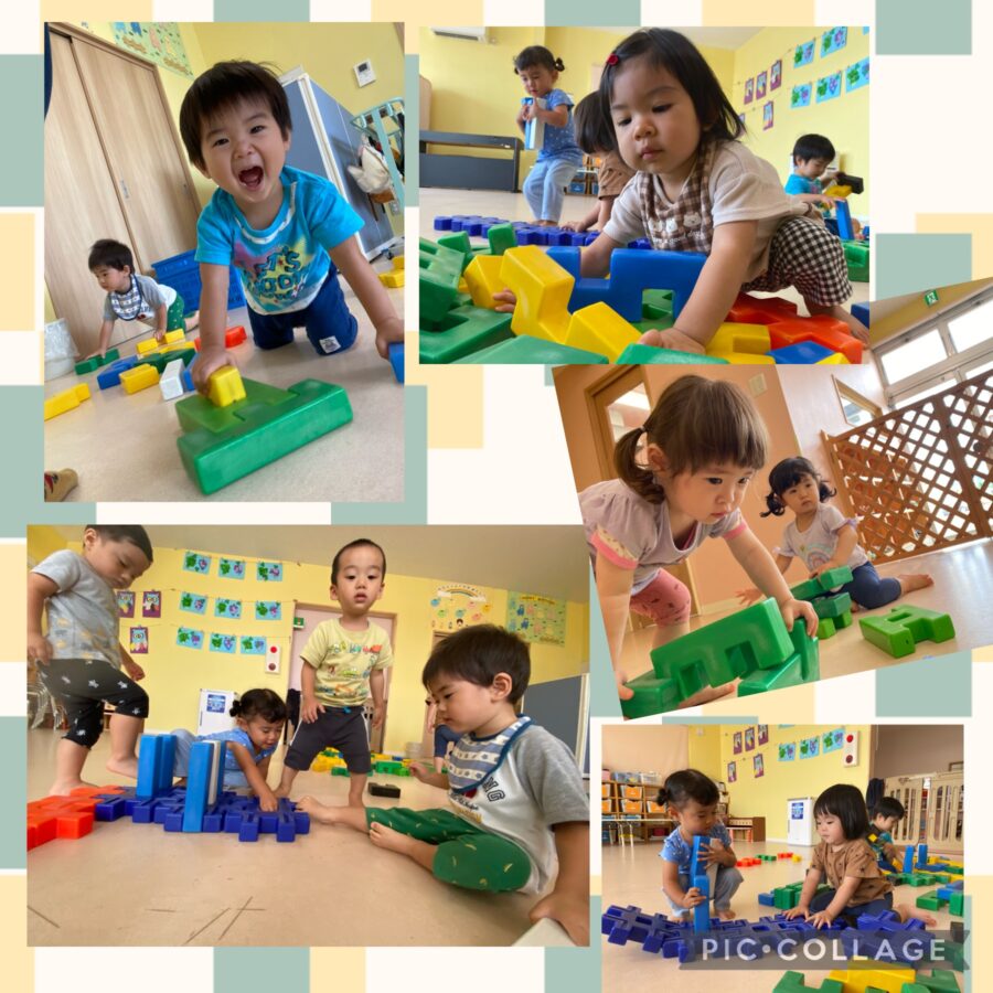 ミカン組さんは大型ブロックで遊びました♬いろいろな形のブロックを上手く繋げたり重ねたりしながら、黙々と作る子ども達!お友達と一緒に車を作り、『バスにのって♬』の曲に合わせてドライブ🚗♪