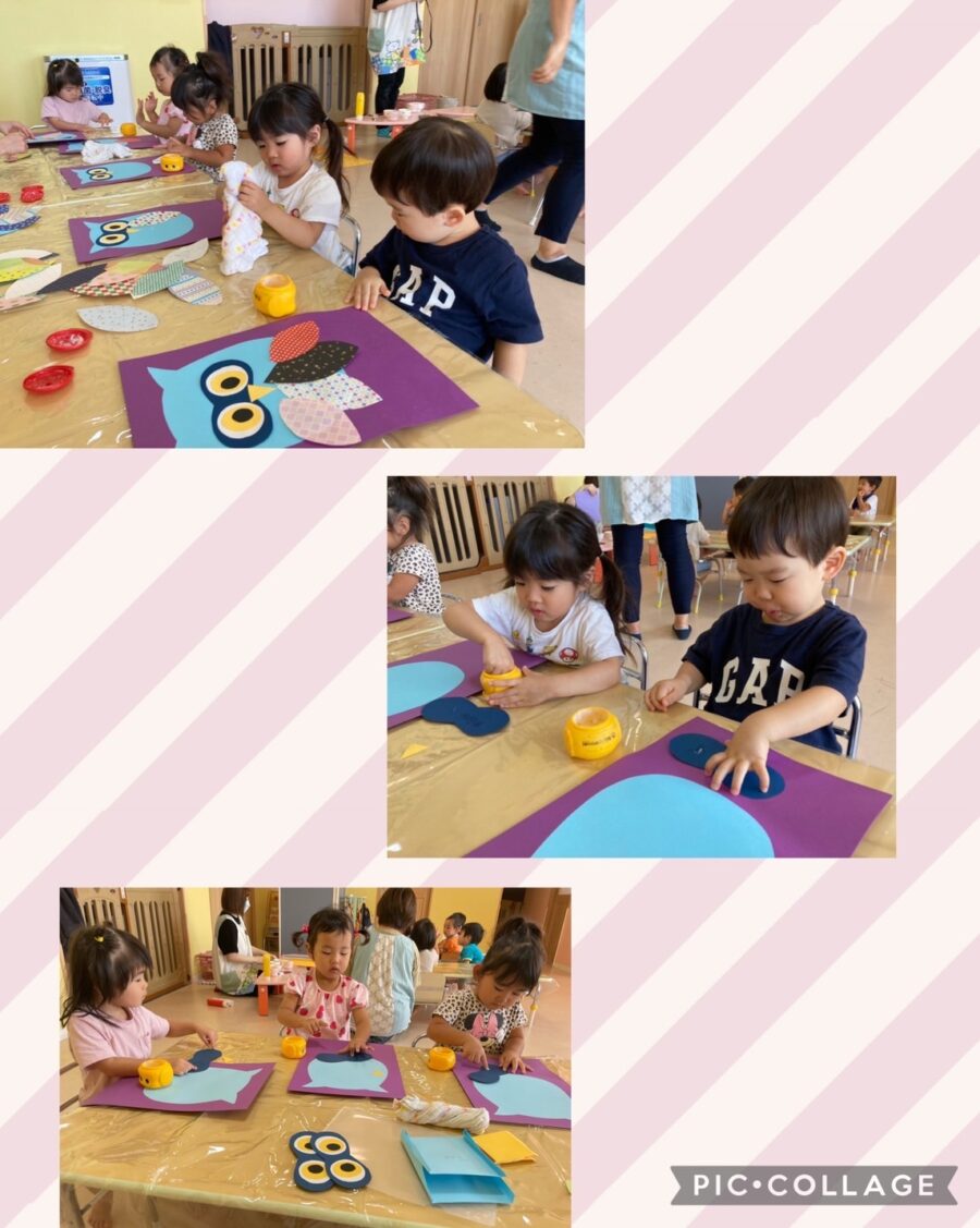 初めてのりを使った製作でしたが、手にのりを付けて目や鼻、羽を上手に貼り、可愛いフクロウを完成しました😊