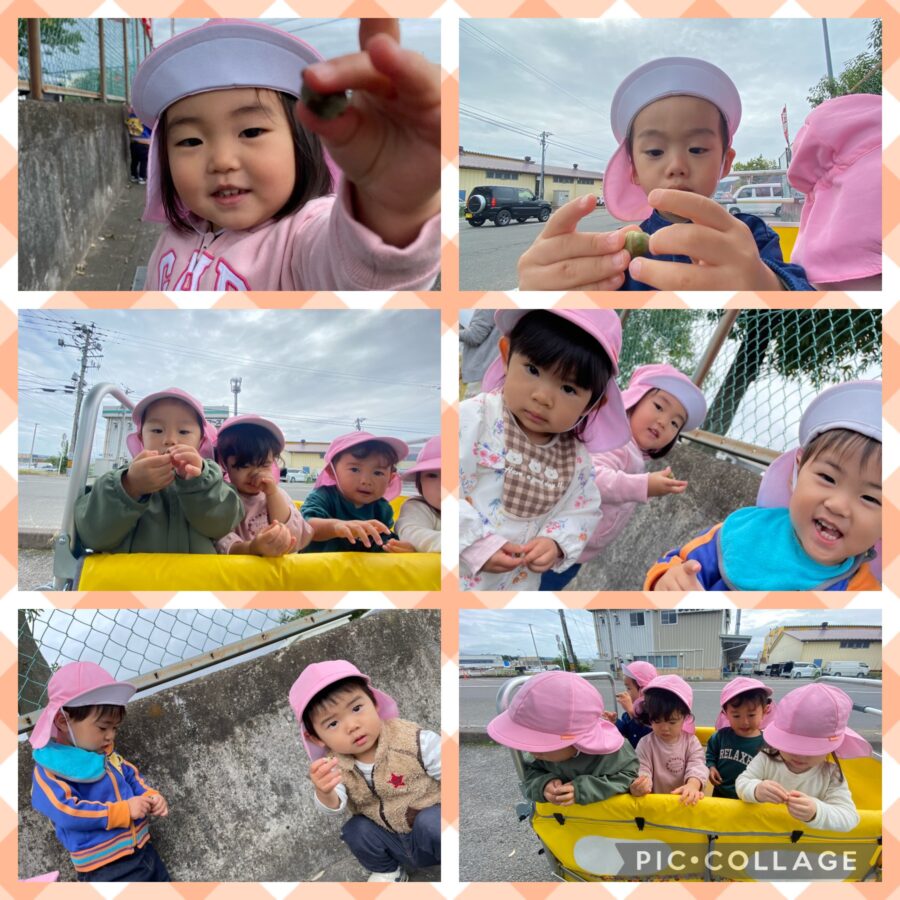 ミカン組さんは、駅方面へおさんぽに行って来ました♪道端に咲いてた、くっつき虫を取りお洋服や帽子に付けて大喜びの子ども達!また、どんぐりも大きくなったかな〜といつも楽しみにしているミカン組さん!赤ちゃんどんぐりが落ちていたので拾って来ました♪