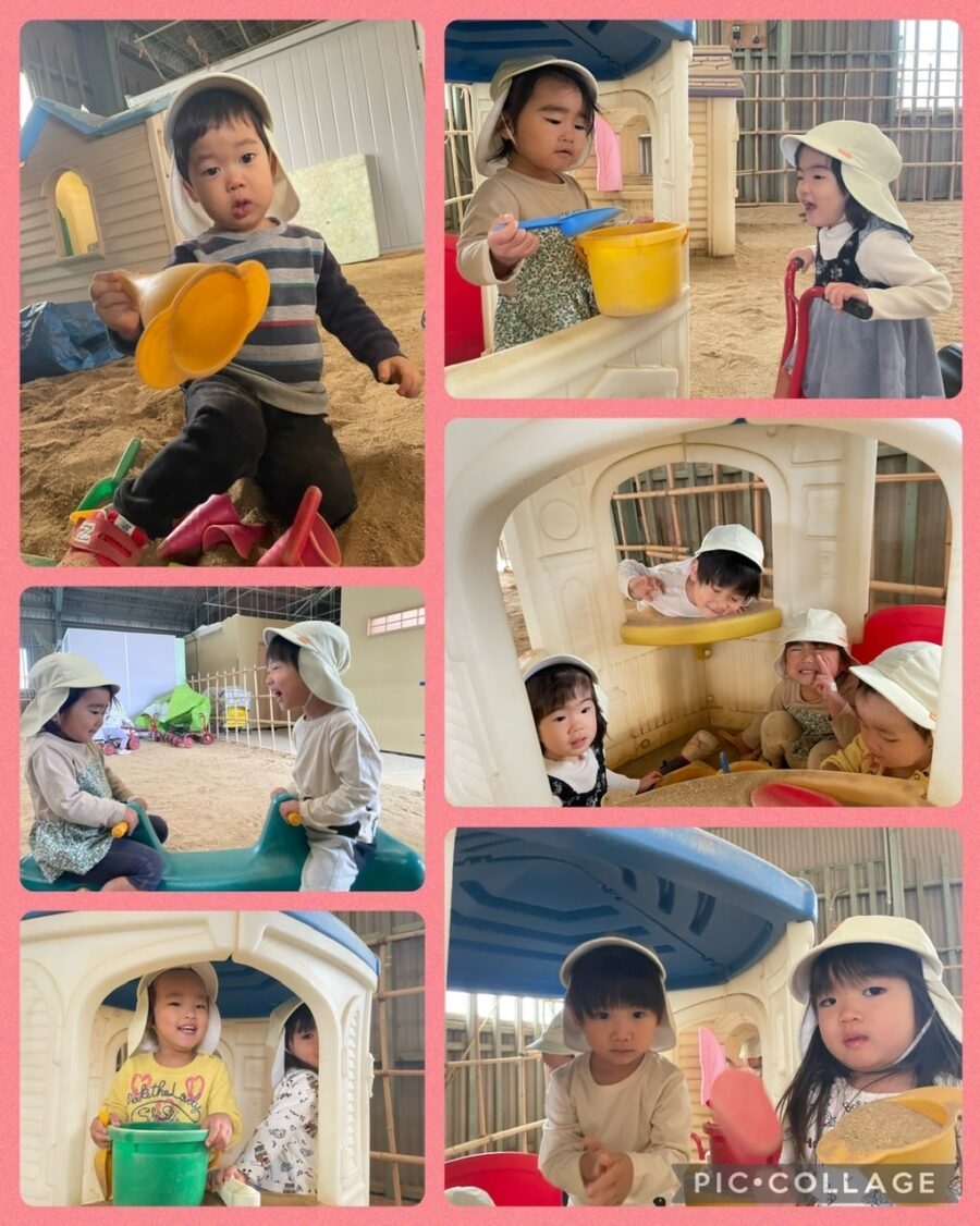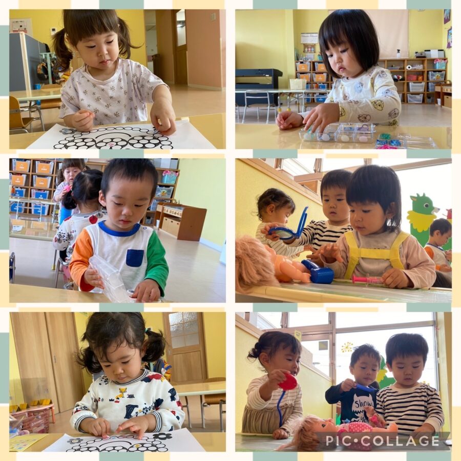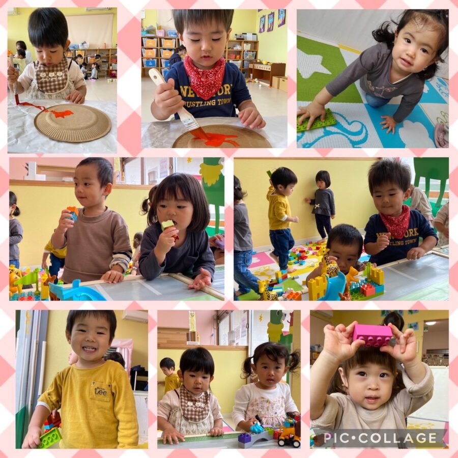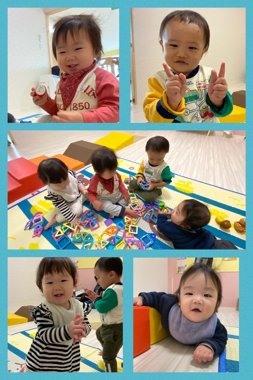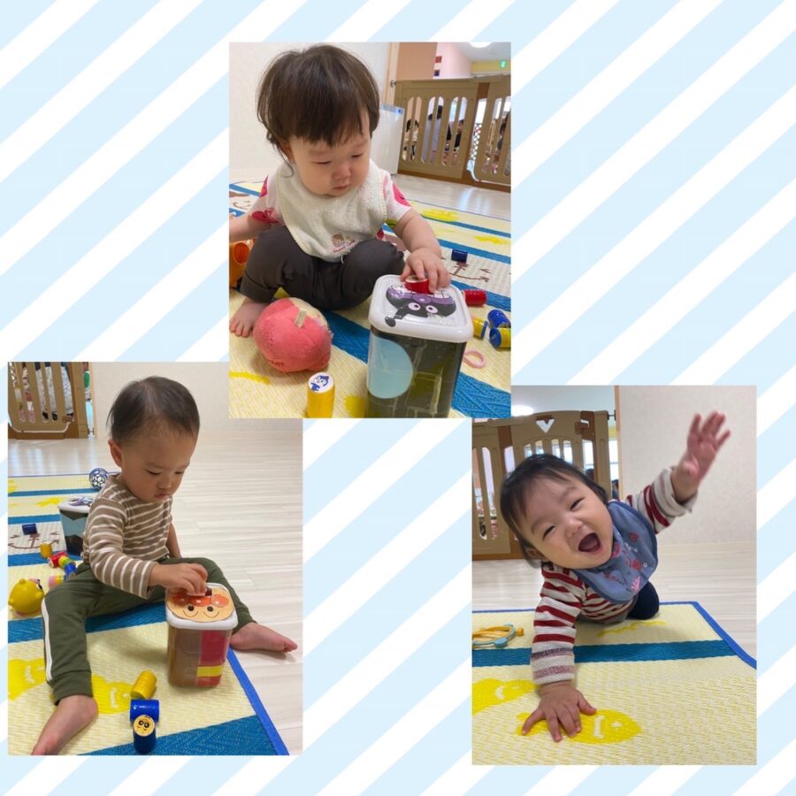 ポム組さんは、ハイハイマットで遊んだり、磁石ブロック、ぽっとん落とし、ボールなどでたくさん遊び、ニコニコの子ども達でした😄